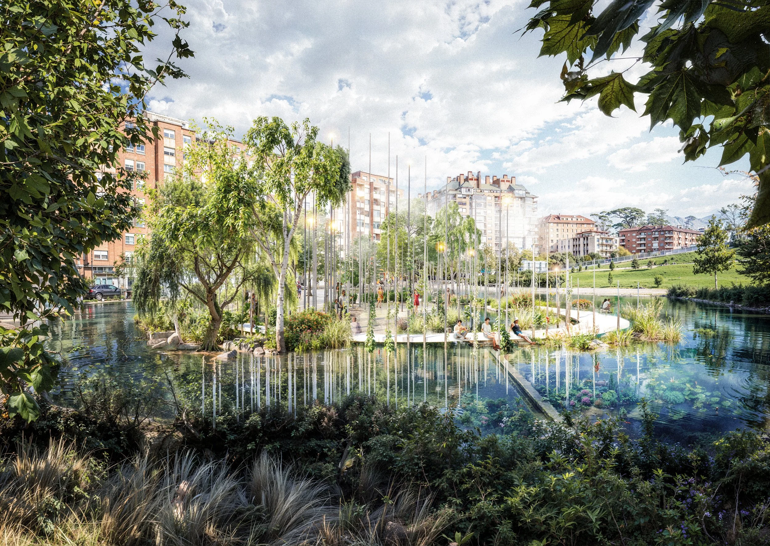 Esta isla climática propuesta para el Parque Felipe VI busca recuperar las características de las llanuras fluviales, tanto de manera simbólica como funcional. Así, inspirada en la geometría y los procesos naturales de estos territorios, la propuesta plantea un micro ecosistema enfocado en la reducción de temperatura y la regeneración ecológica mediante las siguientes acciones: