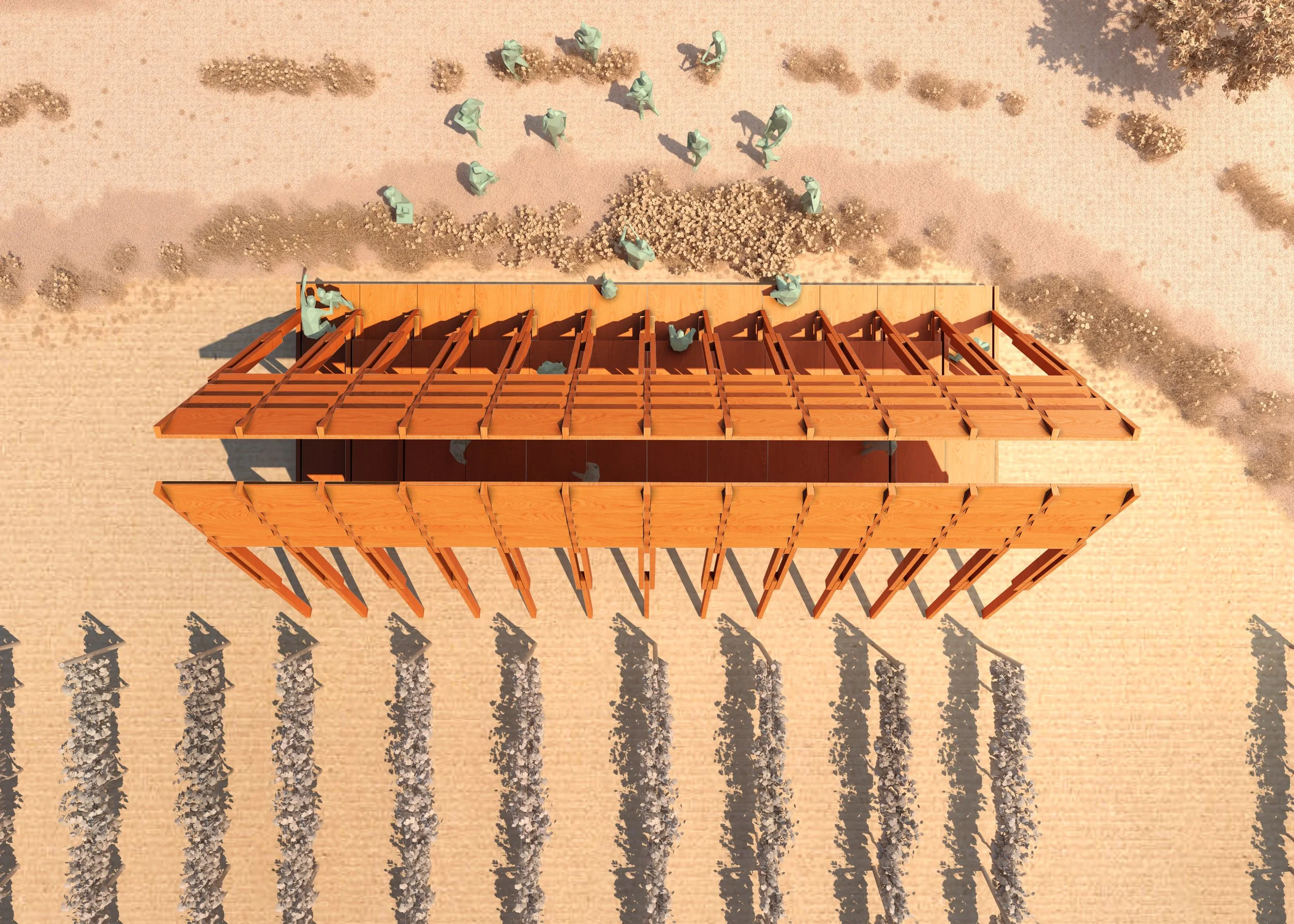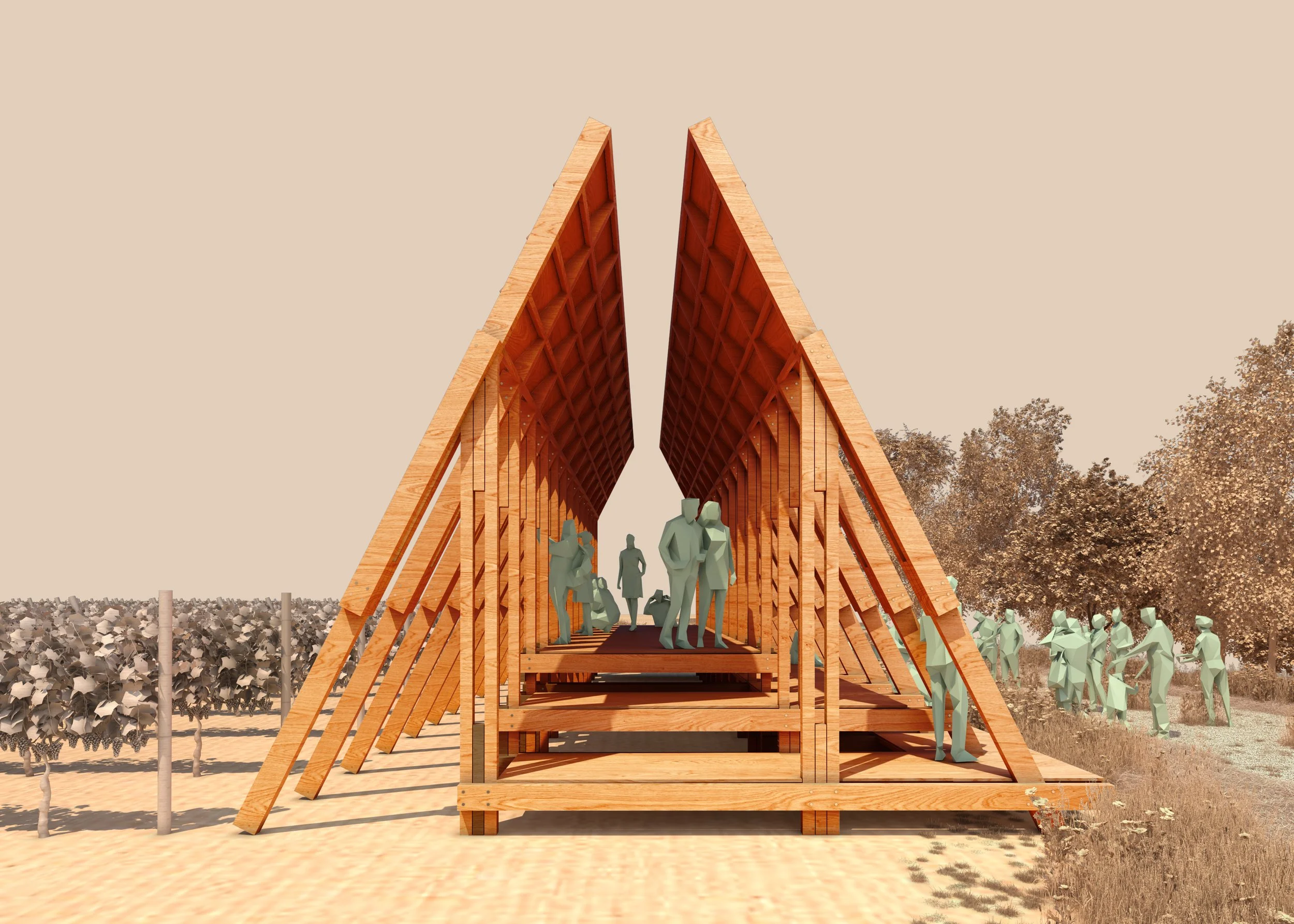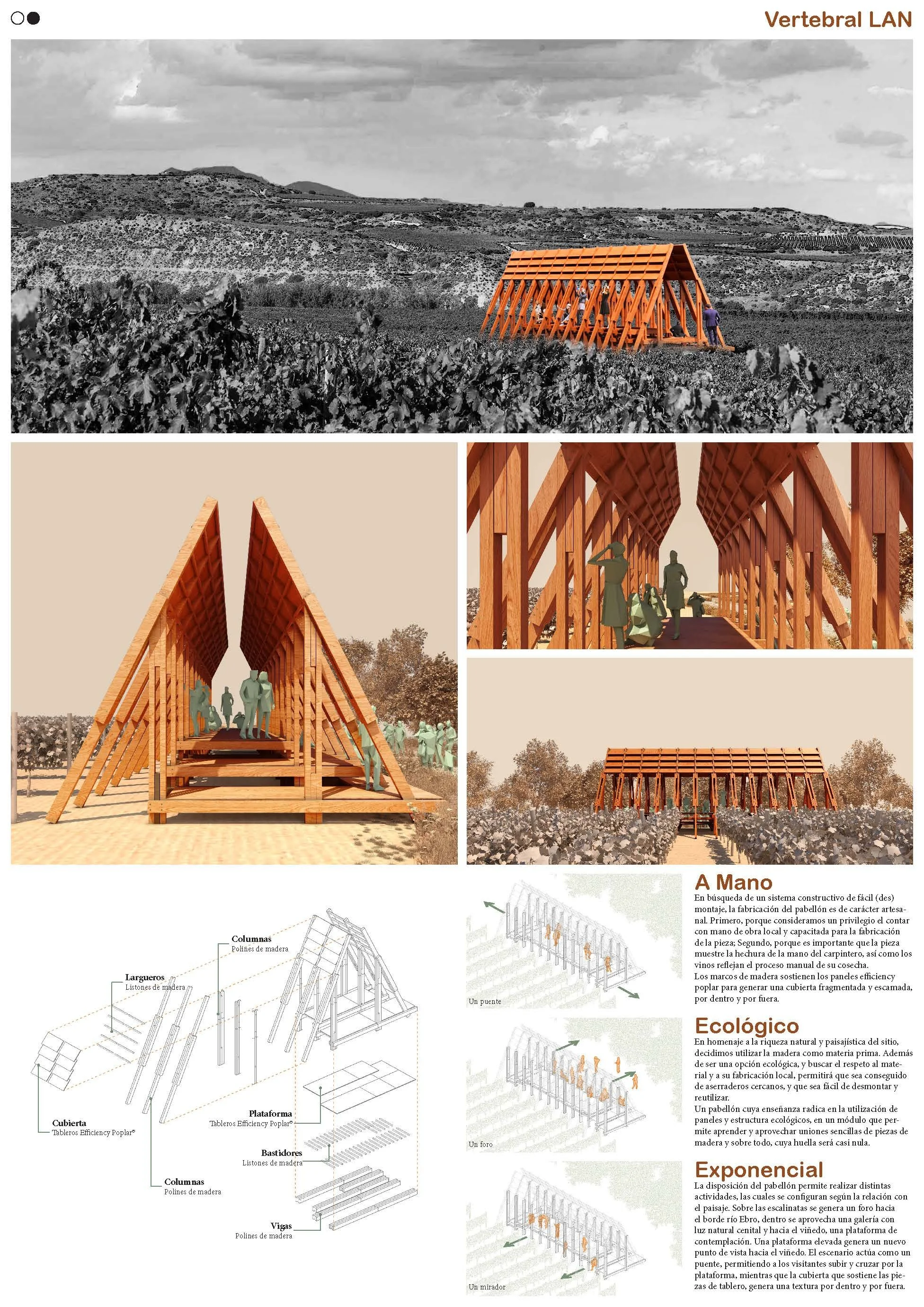 La disposición del pabellón permite realizar distintas actividades, las cuales se configuran según la relación con el paisaje. Sobre las escalinatas se genera un foro hacia el borde río Ebro, dentro se aprovecha una galería con luz natural cenital y hacia el viñedo, una plataforma de contemplación. Una plataforma elevada genera un nuevo punto de vista hacia el viñedo. El escenario actúa como un puente, permitiendo a los visitantes subir y cruzar por la plataforma, mientras que la cubierta que sostiene las piezas de tablero, genera una textura por dentro y por fuera.